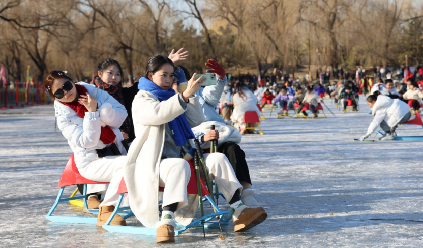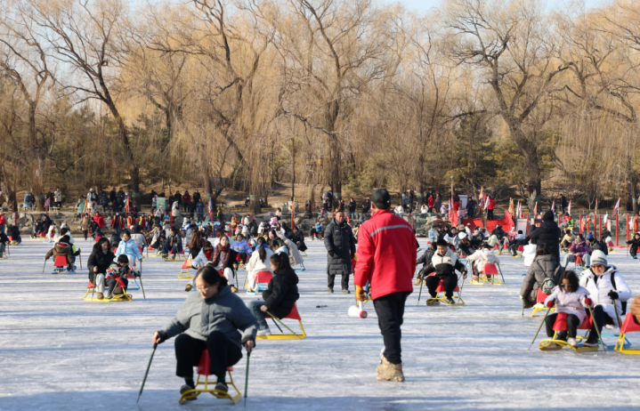 滑冰场设有单人冰车、双人冰车、冰上自行车、电动狗拉雪橇等传统游玩项目,游客可与家人、朋友一起在冰上尽情玩耍、互动,享受美好时光。